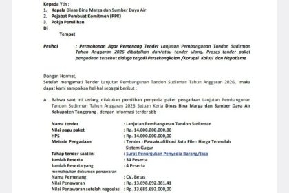 http://Rajawali Times Nusantara.site Jakarta, 6 April 2026 — Aroma tak sedap terkuak dari Dinas Bina Marga Sumber Daya Air Kabupaten Tangerang, Proses tender proyek Lanjutan Pembangunan Tandon Sudirma...